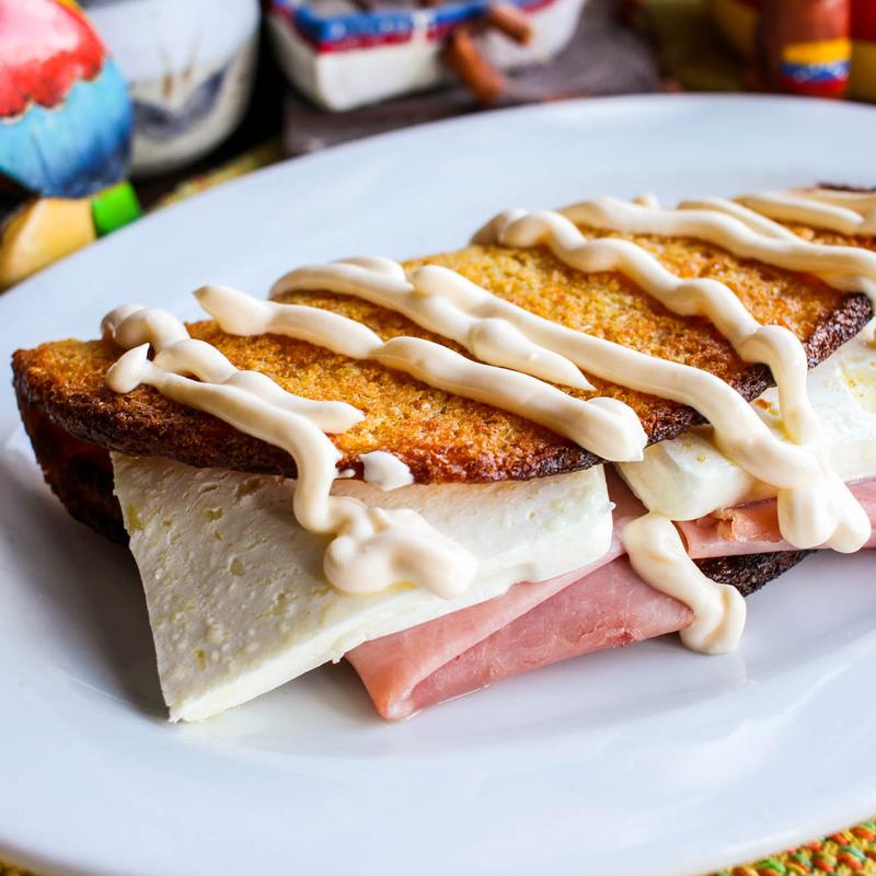 Two eggs any style, grilled arepa, ham, black beans, and cheese.