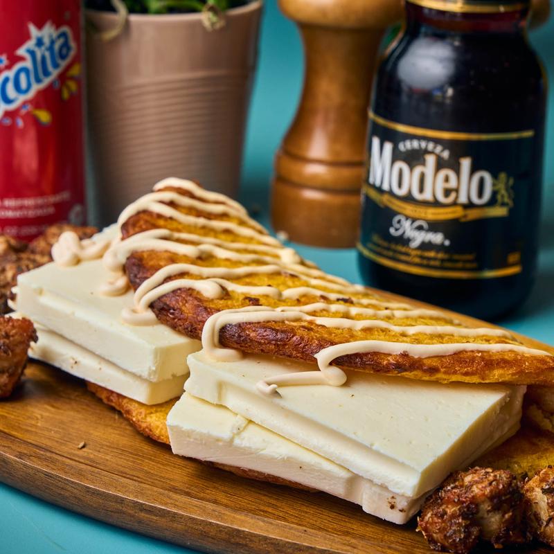 Crispy tostones, topped with shredded chicken, pork, and beef. Then topped with coleslaw, pink sauce, and paisa cheese.