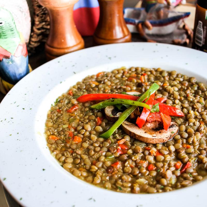 Lentil stew topped with mushrooms, grilled red, and green peppers. Served with Latin salad.